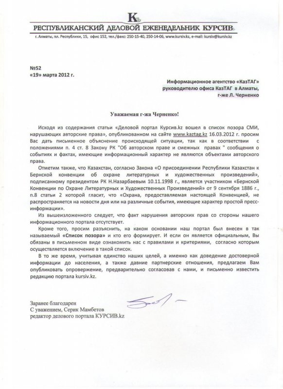 Редакция делового портала КУРСИВ.kz направила официальное письмо редакции ИА «КазТАГ» с просьбой разъяснить: на каком основании наш портал был внесен в так называемый «Список позора» и кто его формирует?